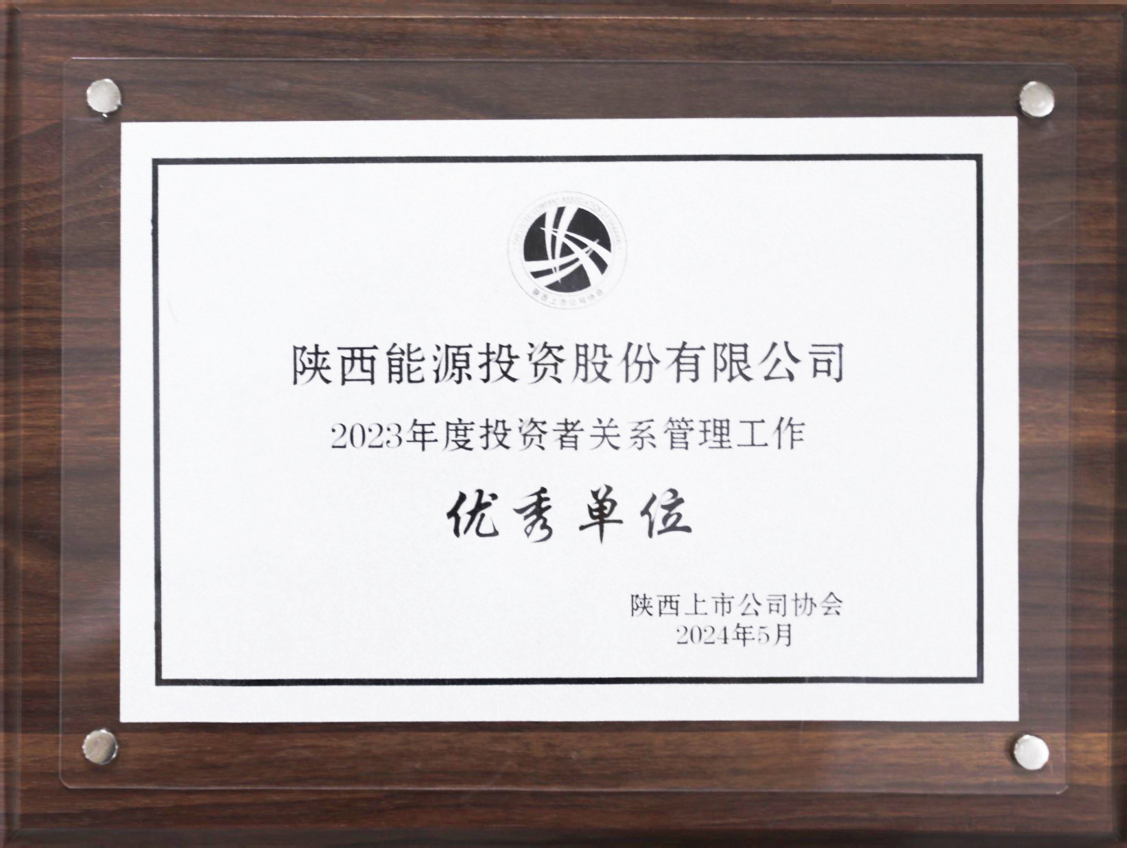 5月15日,陜西能源榮獲陜西上市公司協(xié)會頒發(fā)的“2023年度投資者關(guān)系管理工作優(yōu)秀單位”。陜西能源上市以來,始終聚焦主業(yè),致力于保持長期穩(wěn)定發(fā)展,面對資本市場的復(fù)雜環(huán)境,堅持誠實守信、真實透明、規(guī)范治理,持續(xù)提升公司內(nèi)在發(fā)展質(zhì)量,高度重視投資者關(guān)系管理,在信息披露、投資者溝通機制建設(shè)、市場形象打造等方面取得了豐碩成果,并積極回饋投資者、保護投資者利益,推動公司實現(xiàn)高質(zhì)量發(fā)展。