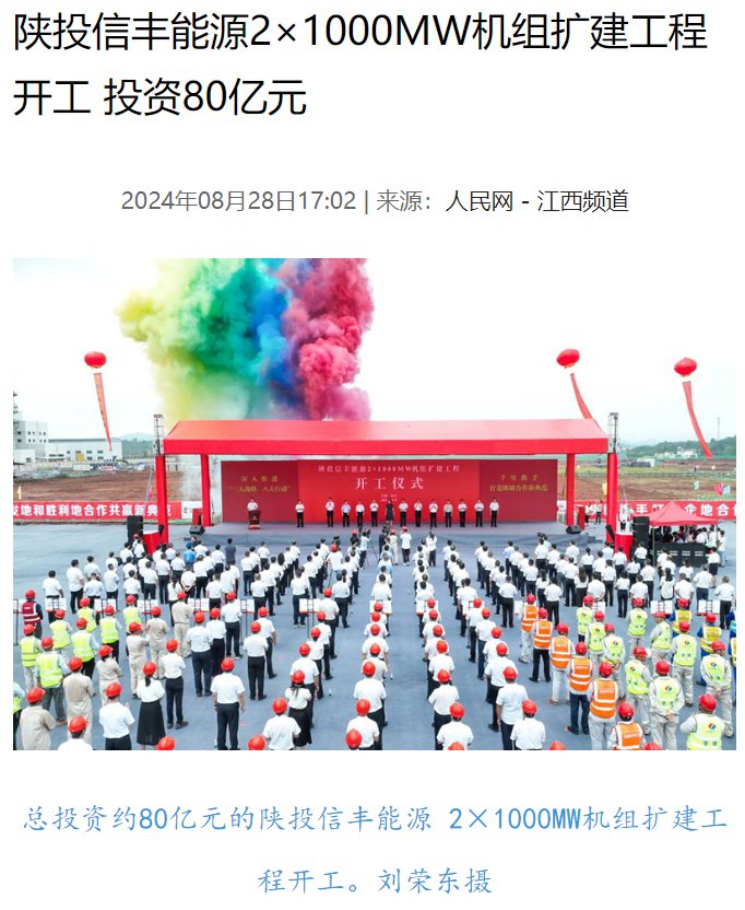 8月28日,陜投信豐能源 2×1000MW機組擴建工程(信豐電廠二期項目)在信豐縣開工。人民網、江西日報、贛州新聞聯播等多家主流媒體進行報道。