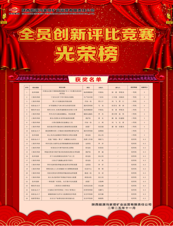 近期,馮家塔運(yùn)營(yíng)組織開展了2025年第四次全員創(chuàng)新評(píng)比競(jìng)賽。會(huì)上對(duì)技術(shù)創(chuàng)新類、工器具革新類、智能化創(chuàng)新類、創(chuàng)新管理法類、精優(yōu)作業(yè)法類、創(chuàng)意金點(diǎn)子類等六類、共計(jì)30項(xiàng)全員創(chuàng)新項(xiàng)目進(jìn)行了評(píng)審,會(huì)上經(jīng)過(guò)嚴(yán)格評(píng)選,最終確定26項(xiàng)創(chuàng)新項(xiàng)目獲獎(jiǎng)。其中一等獎(jiǎng)2項(xiàng)、二等獎(jiǎng)3項(xiàng)、三等獎(jiǎng)6項(xiàng)、優(yōu)秀獎(jiǎng)15項(xiàng)。