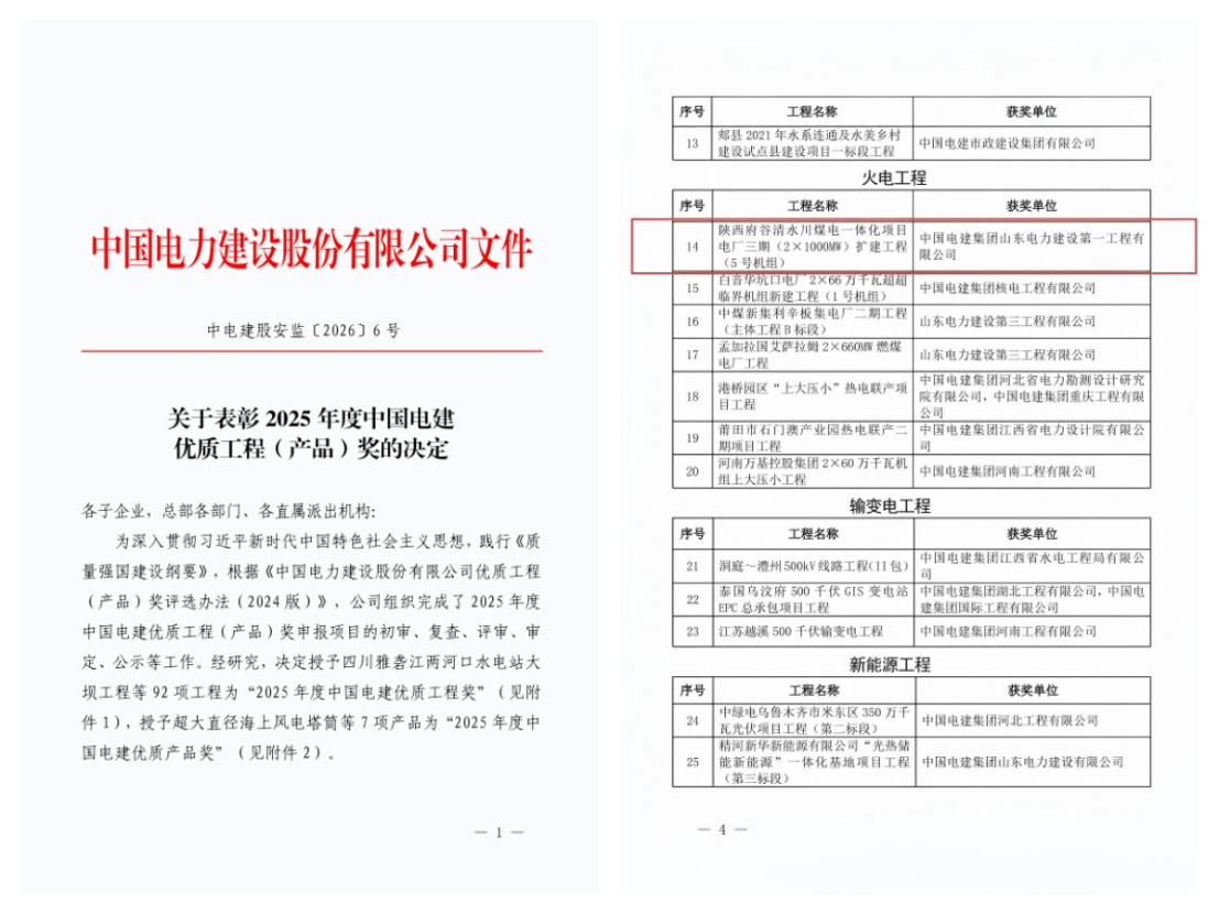 近日,從中國電力建設集團傳來喜訊,清水川能源三期擴建工程5號機組憑借規范高效的管理體系、精益求精的質量標準、精湛過硬的施工工藝、先進可靠的技術水平、安全穩定的運行性能,榮獲2025年度中國電建優質工程獎。