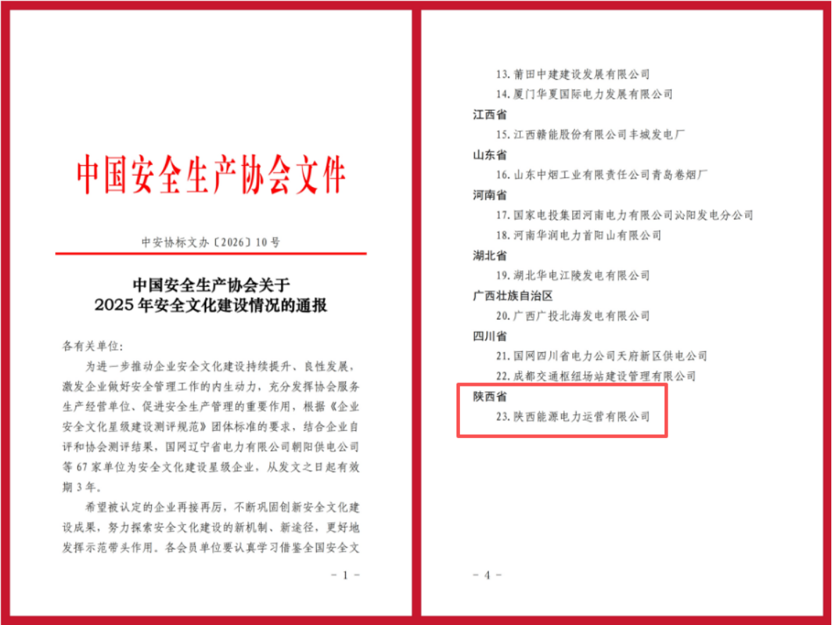 近日,中國安全生產協(xié)會印發(fā)《關于2025年安全文化建設情況的通報》,電力運營榮獲“2025年安全文化建設五星級企業(yè)”榮譽稱號。此項榮譽既是行業(yè)對企業(yè)安全文化建設工作的充分認可,也是對長期堅守安全發(fā)展理念、持續(xù)夯實安全管理基礎的權威肯定。