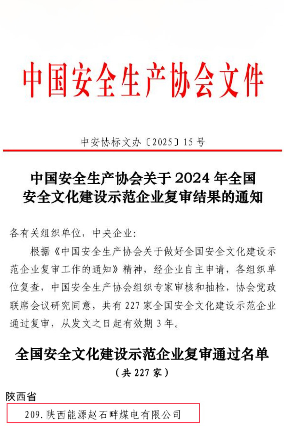 近日,中國安全生產協會公布2024年全國安全文化建設示范企業復審結果,趙石畔煤電順利通過復審,再次榮獲“全國安全文化建設示范企業”稱號。