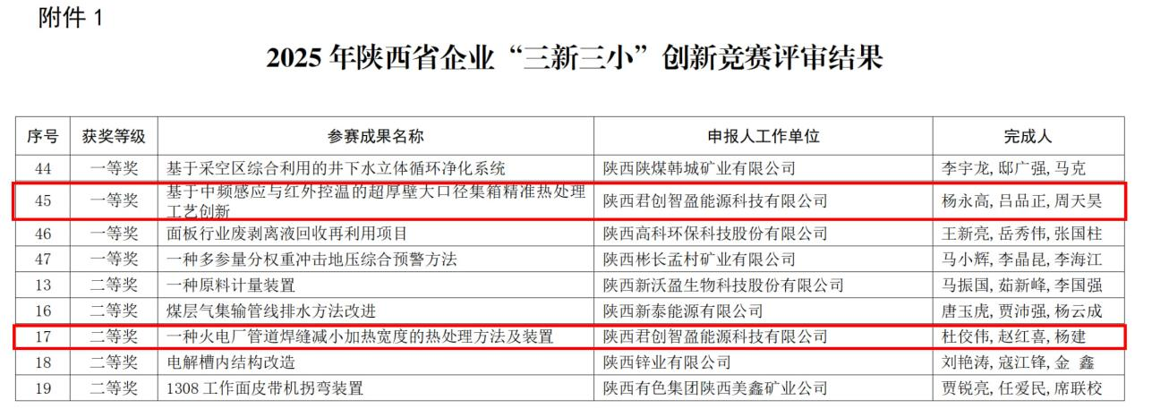 7月20日,電力運營獲悉2025年陜西省企業“三新三小”創新競賽中,公司下屬子公司君創科技《基于中頻感應與紅外控溫的超厚壁大口徑集箱精準熱處理工藝創新》斬獲一等獎,《一種火電廠管道焊縫減小加熱寬度的熱處理方法及裝置》獲二等獎。