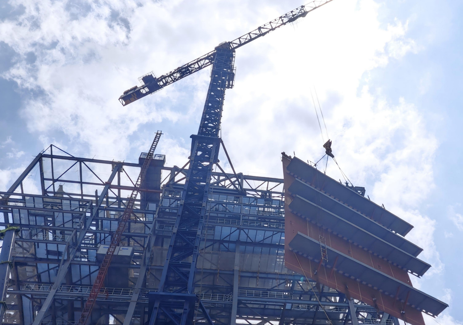 時隔兩日,8月10日,#2鍋爐K1大板梁成功吊裝,這標志著該工程#2鍋爐鋼結構安裝進入收尾階段,也是繼#1 鍋爐受熱面首吊完成后的又一標志性節點。據悉,該工程使用的1000MW二次再熱超超臨界Π型鍋爐共5個大板梁,分別布置在K1、K2、K3、K4、K5列,其中K2、K3、K4采用疊梁形式,最大單件為 K4 上梁,重量達到 143.475 噸,主吊機械為160噸平臂吊和900噸履帶吊。